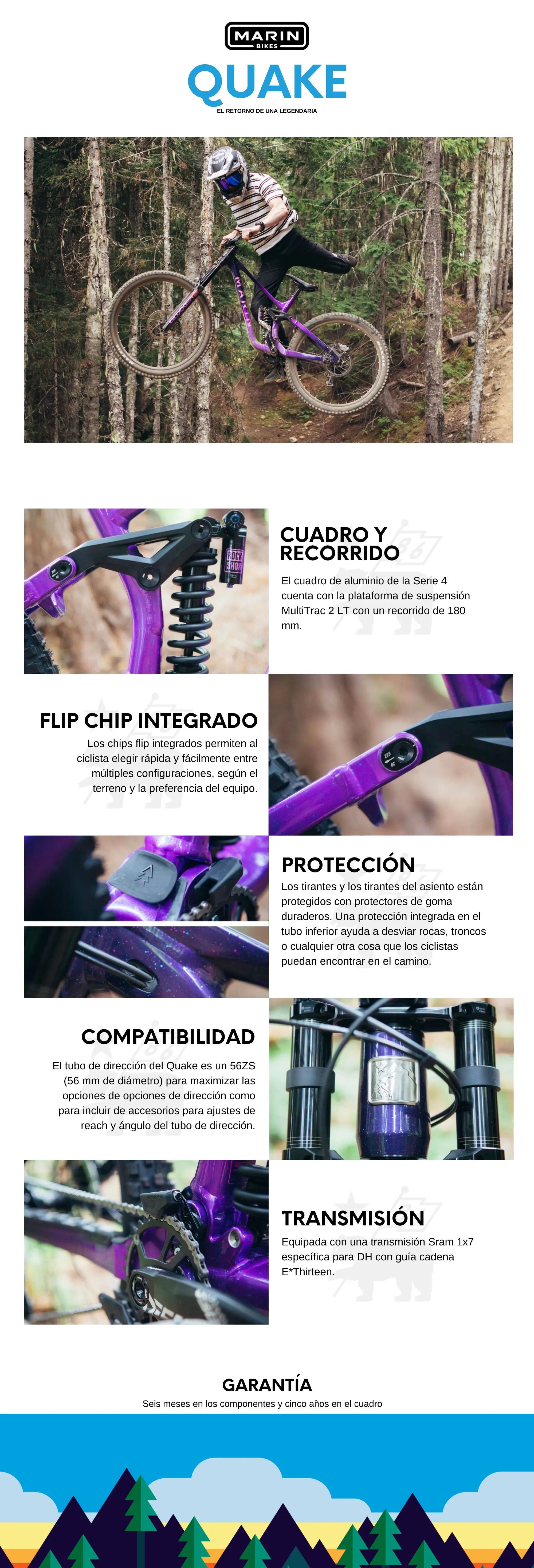 - Cuadro: All New Series 4 Alloy, 180mm travel MultiTrac LT Suspension, Adjustable CS Length/BB Height, 27.5" or 29" compatible, 148mm Rear Thru-Axle, & frame protection, UDH