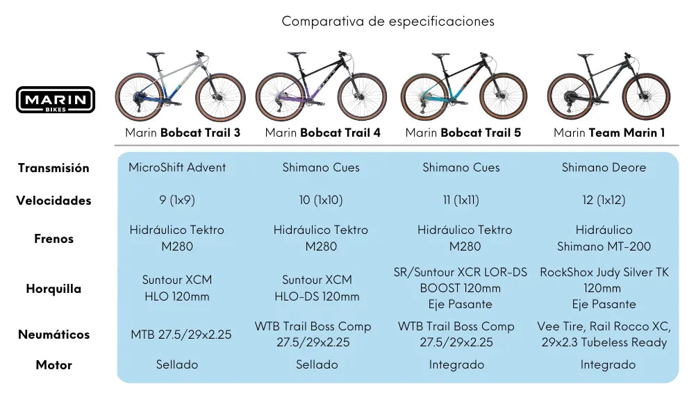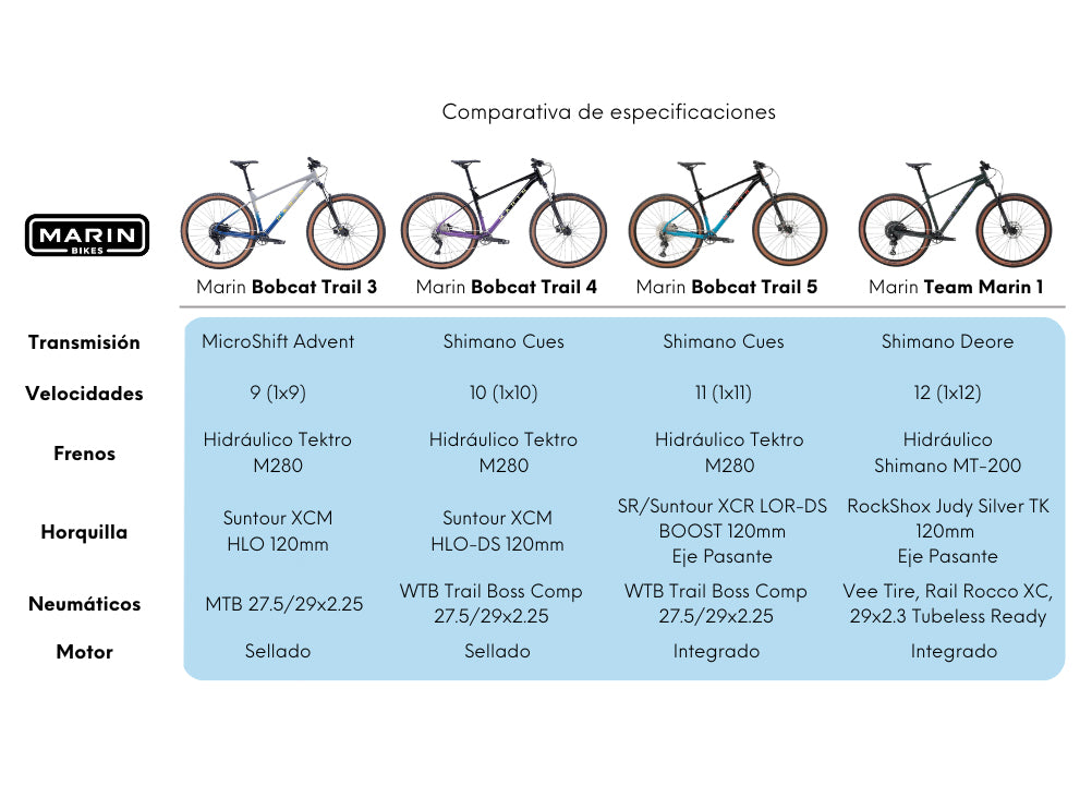 La Marin Bobcat Trail 3 es nuestra Bobcat más asequible, que genera las mayores sonrisas por la menor cantidad de dinero posible. Su corazón es un cuadro de aluminio Serie 2 que es rápido, cómodo y divertido en los senderos. Hay opciones para ruedas de 27,5” y 29” y la bicicleta está construida con una horquilla de suspensión SR/Suntour que domina los senderos, transmisión microSHIFT de 9 velocidades de amplio rango y potentes frenos hidráulicos Tektro.