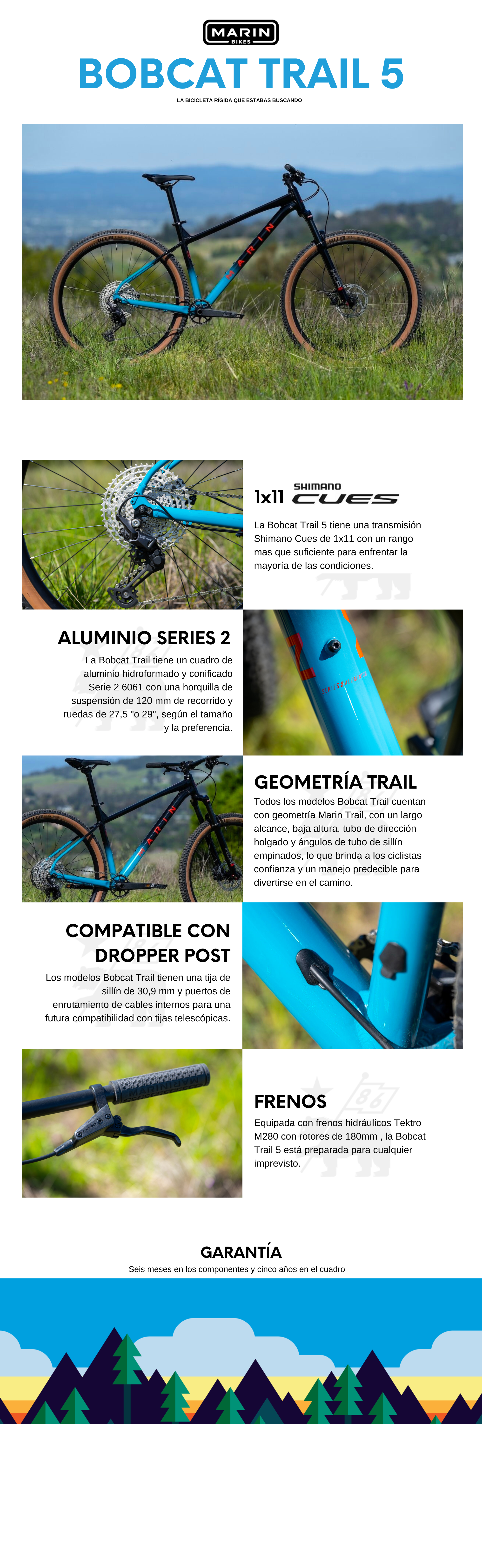 La mejor de las Bobcats, la Marin Bobcat Trail 5, es nuestra oportunidad de llevar al límite lo que nuestra bicicleta de montaña con la mejor relación calidad-precio puede hacer. ¿Cuadro de aluminio Serie 2 rápido, cómodo y divertido? Listo. ¿Transmisión 1X? Lo tienes. ¿Horquilla SR/Suntour XCR? Seguro. ¿Cambios Shimano CUES de 11 velocidades, frenos hidráulicos Tektro y neumáticos WTB de pared de color tostado de moda? ¡Por supuesto! Y, por supuesto, tu elección de ruedas de 27,5” o 29”.