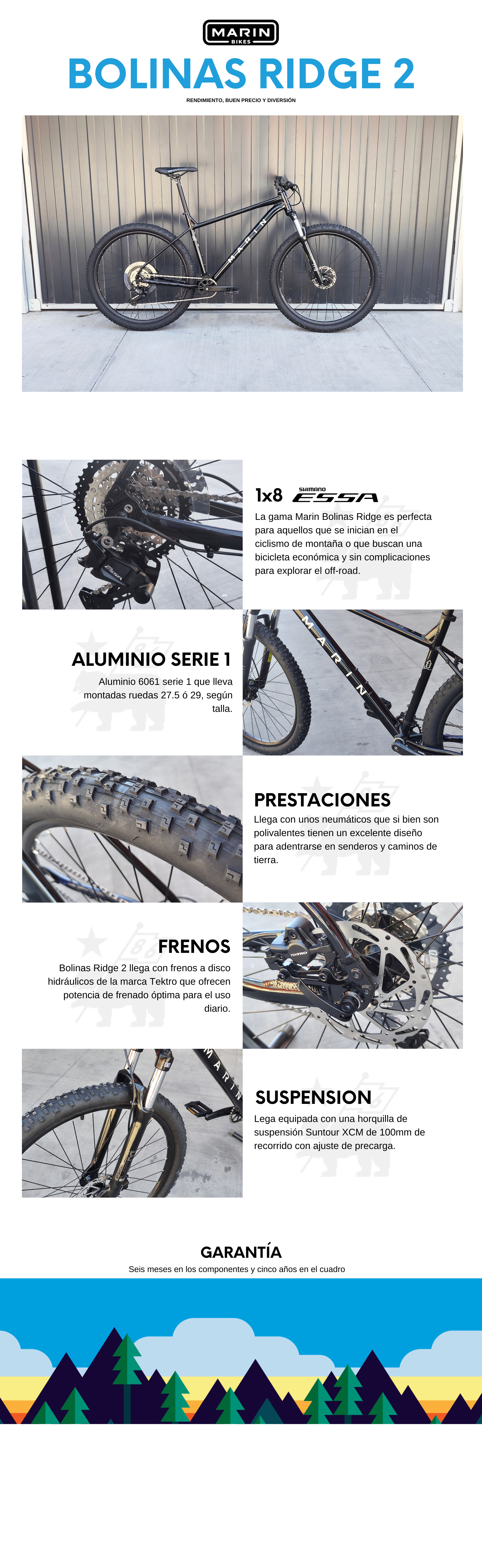 La Bolinas Ridge 2 es nuestra Bolinas mejorada, que ofrece un nivel superior de diversión y componentes. La Bolinas Ridge 2 incorpora frenos de disco hidráulicos Tektro e incorpora una horquilla de suspensión SR/Suntour, neumáticos todoterreno fiables y con buen agarre, y una gran cantidad de componentes Marin de alta gama. La Bolinas es ideal para lanzarse a los senderos y superar tus propios límites.