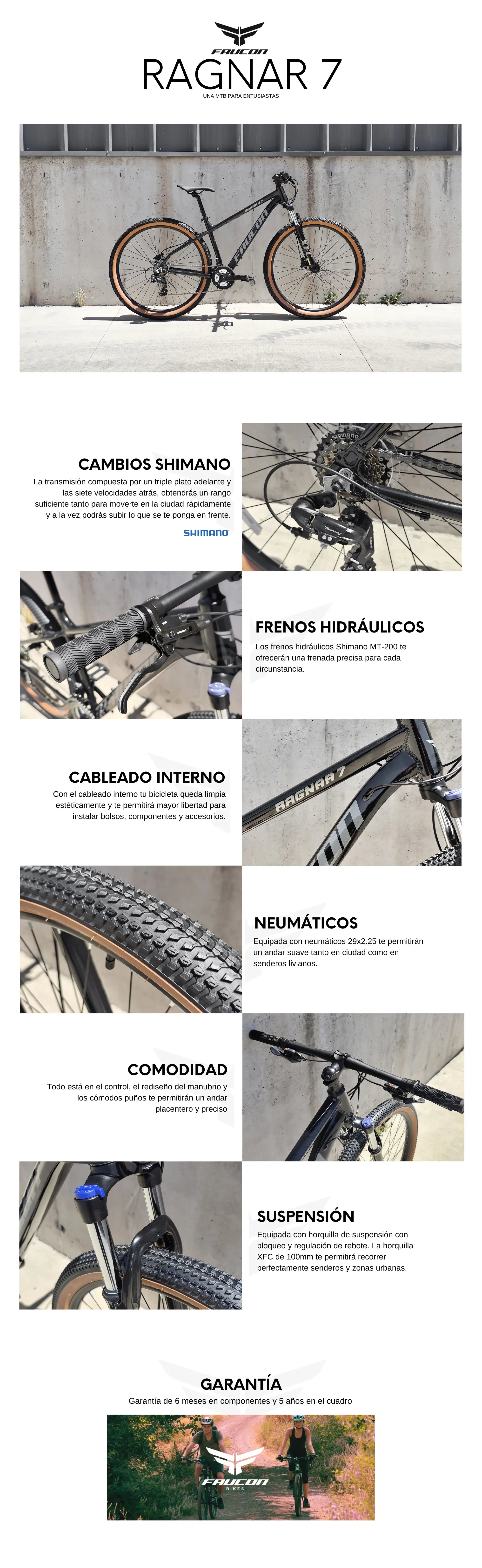 La Faucon Ragnar 7 Aro 27,5 es la elección ideal para ciclistas que prefieren una conducción más reactiva y juguetona. Gracias a su tamaño de rueda 27,5", esta bicicleta destaca por su facilidad para acelerar y su agilidad al trazar curvas cerradas. Construida con un cuadro de aluminio hidroformado Premier-T y tecnología Obtus, ofrece una estructura ligera pero sumamente resistente, capaz de absorber las exigencias del terreno con soltura.