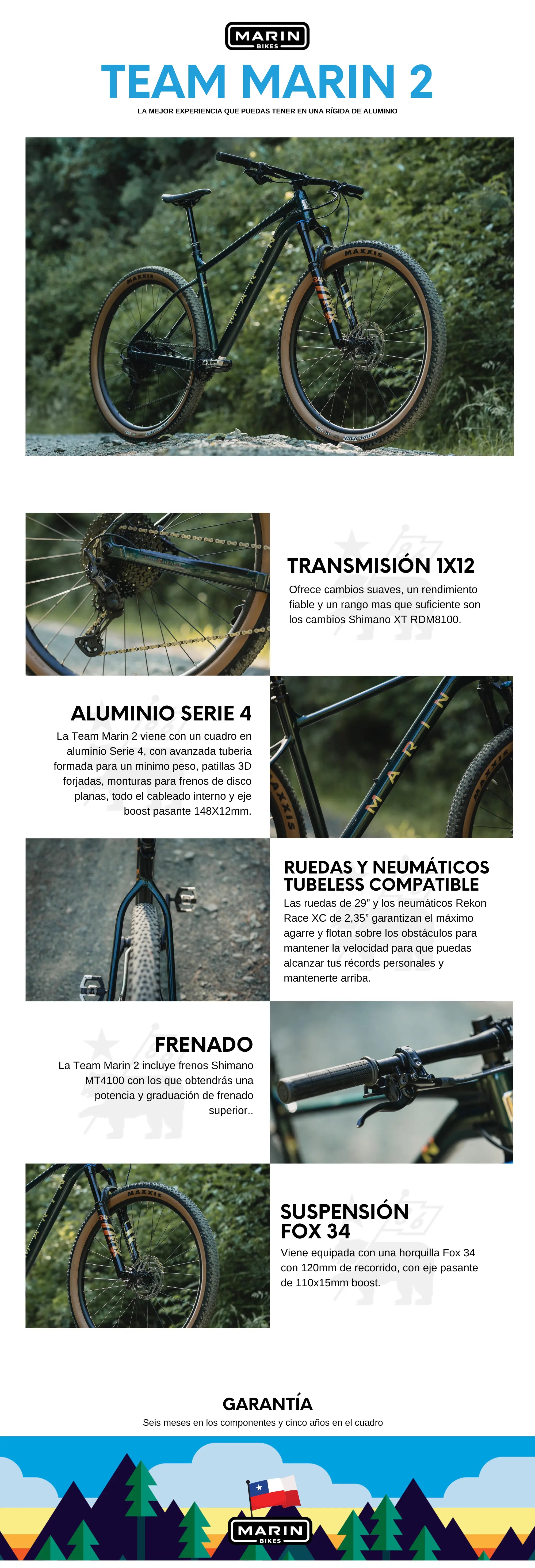 La Team Marin 2, líder en la categoría de XC, es lo suficientemente rápida como para subir al podio en tu próxima carrera de XC, sin perder su potencia en los senderos. Comenzamos con un cuadro de aluminio Serie 4 de alta gama y ruedas de 29” de rodadura rápida y luego agregamos una horquilla Fox 34 StepCast, una transmisión Shimano XT/SLX, frenos TRP G-spec y caucho Maxxis Rekon Race para crear una bicicleta XC para senderos súper divertida, súper capaz y súper rápida.