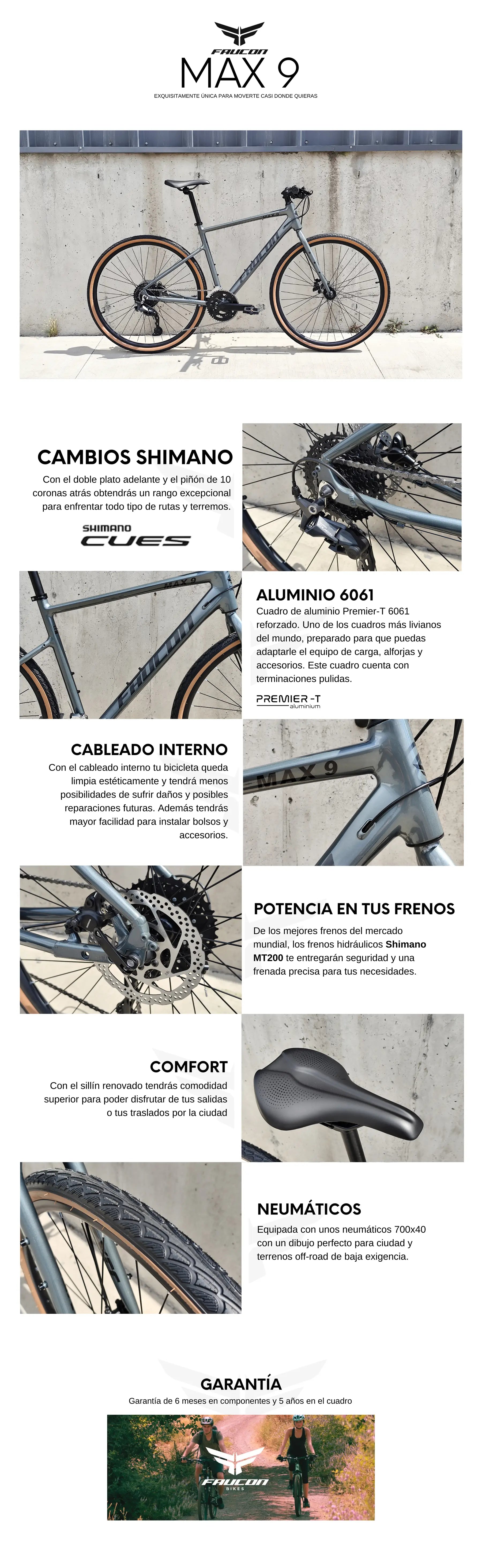 Max 9 es una bicicleta híbrida con un cuadro de aluminio ligero y piezas de calidad que tienen un gran rendimiento para tus aventuras. Es perfecta para salir más, pedalear en muchos kilómetros diarios, hacer un poco de ejercicio, ir al trabajo o incluso hacer cicloturismo en una bici versátil respaldada por Faucon. Al tener neumáticos de 40C logra que la bicicleta también tenga una gran rapidez pero a su vez puedas usarlas en terrenos más complejos. ¡Una verdadera maquina!