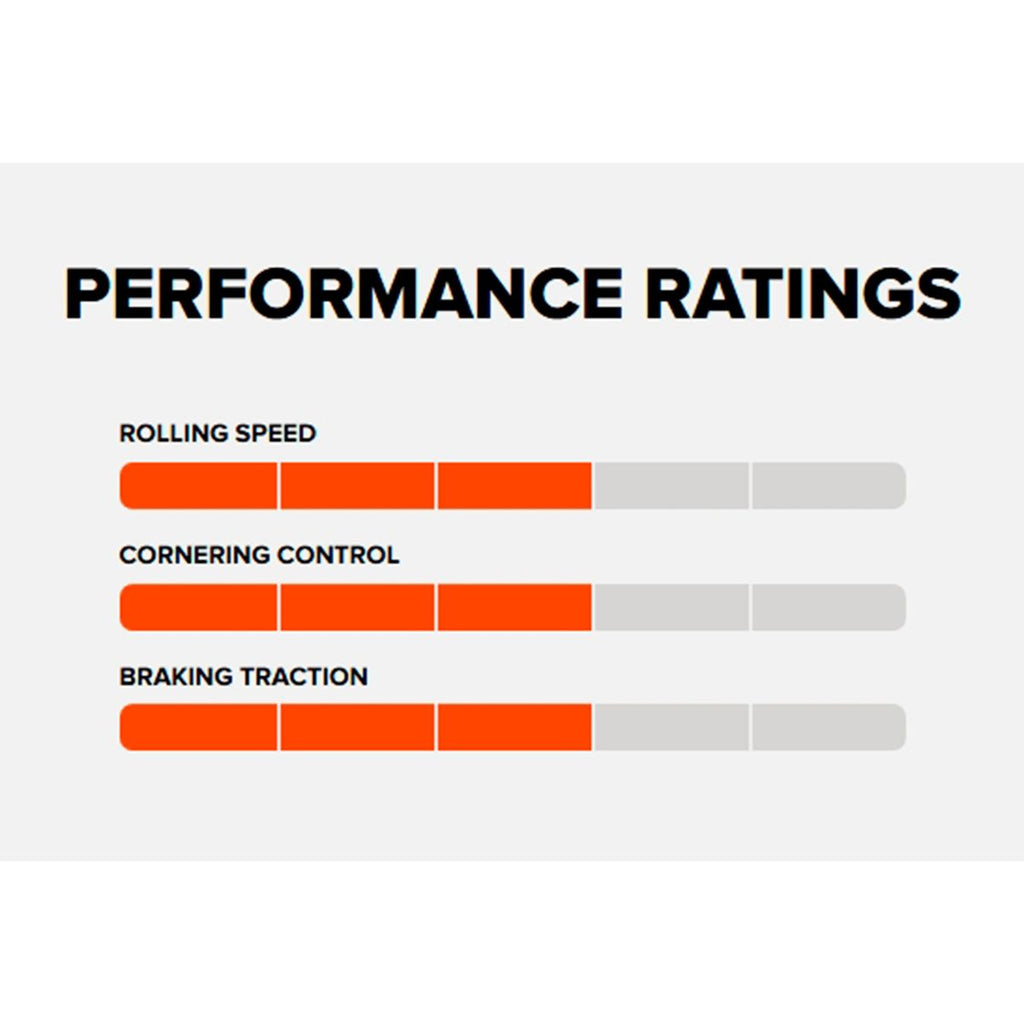Diseño Semi-Slick: La banda de rodadura central de perfil bajo optimiza la aceleración y la eficiencia energética en el pedaleo, mientras que los tacos laterales ofrecen el agarre necesario para mantener la trayectoria en curvas.