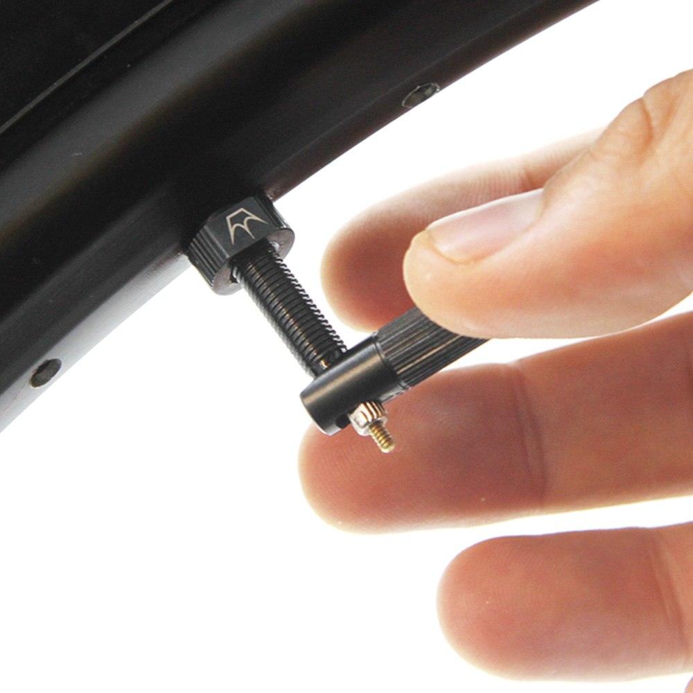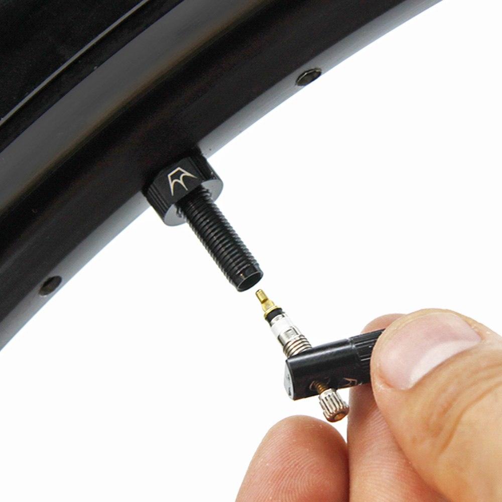 La gran base de goma suave crea fácilmente un sello hermético en orificios de válvula de hasta 8 mm de diámetro. Las tapas de extracción del núcleo de la válvula integradas hacen que quitar la válvula y rellenar con sellador sea muy fácil en el taller o en los propios senderos.